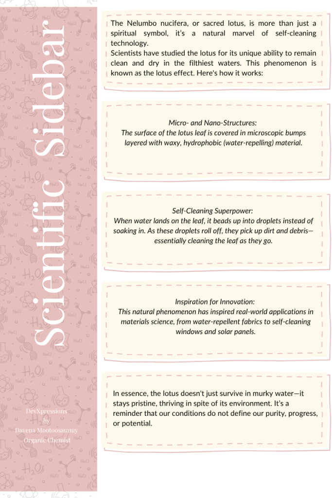 From a chemist’s lens, the lotus is a marvel of evolution. It thrives in murky, stagnant waters—waters that would choke the life out of most plants. Yet the lotus rises daily to bloom in the sun, untouched by the filth around it. Scientifically, this is due to something called the lotus effect: a microscopic structure on its petals and leaves causes water and dirt to bead up and roll off, keeping the plant pristine.